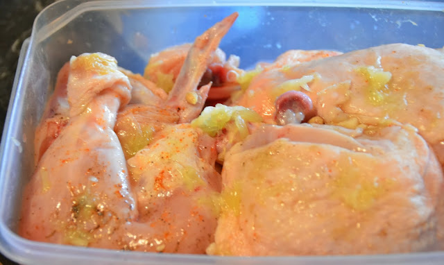 مرغ های قشنگمون (رو که من ترجیح دادم بیشتر رون باشه) وقتی که شستیم و آبش گرفته شده رو با آب لیمو، فلفل سیاه، فلفل قرمز و نمک مخلوط میکنیم تا مارینه بشه و میزاریم ۱ تا ۲ ساعت بمونه.