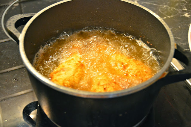 روغن باید به ارتفاع ۳ سانتیمتر باشه تو ماهیتابه یا قابلمه تا وقتی مرغ رو میزاریم تو روغن مرغ غوطه ور بشه.من از قابلمه کوچیک استفاده کردم به جای ماهیتابه.