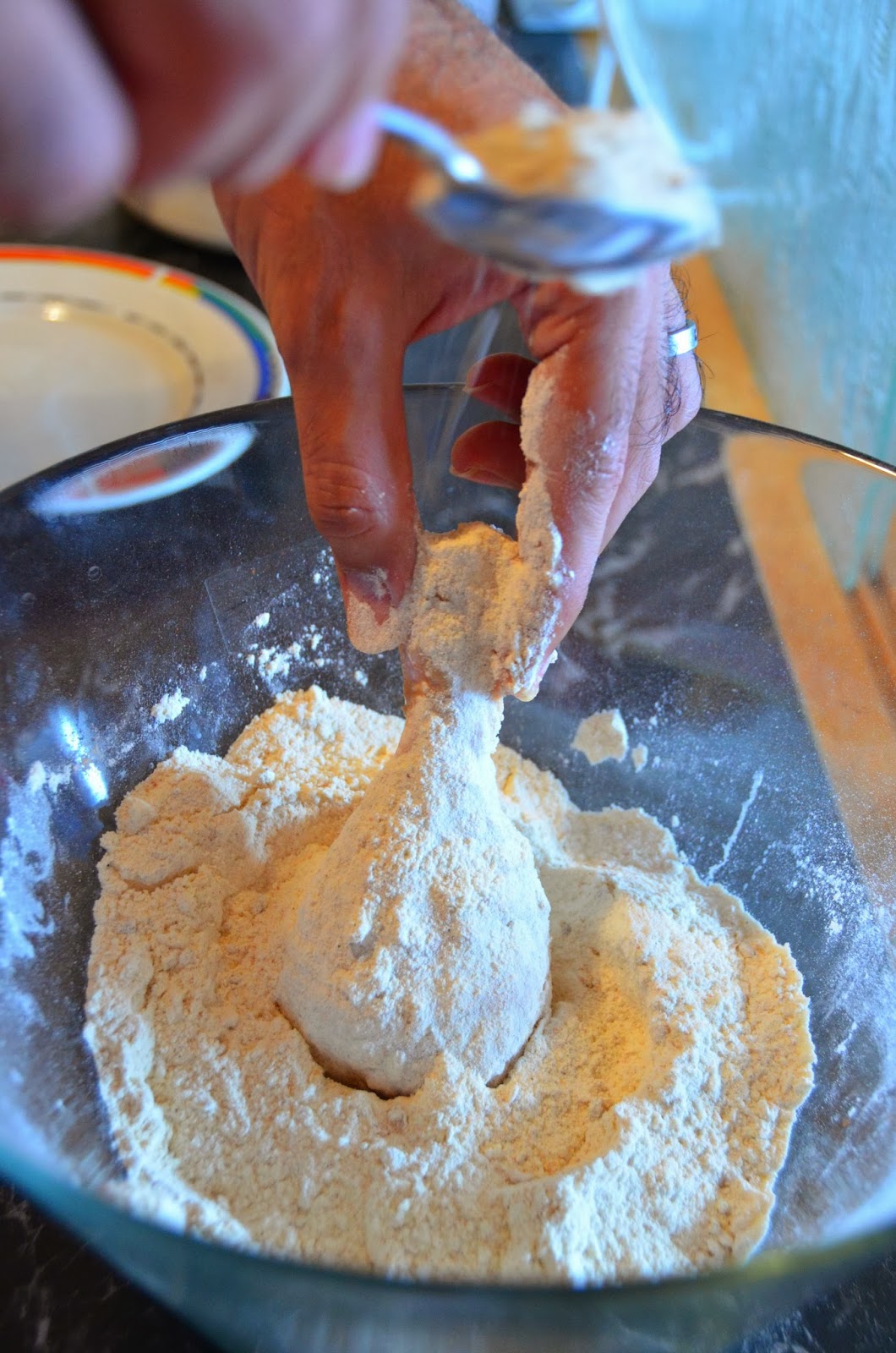 مرغی که ۱ تا ۲ ساعت مارینه شده رو فرو میکنیم تو مخلوط آردی که درست کردیم و خوب همه قسمت های مرغ رو تو آرد میغلتونیم .